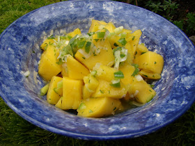 Thank you Betty's Organics for the fair trade Peruvian Mango, it was even numbered, which I appreciate and perfect for my salsa which I am serving with an Asian style steak salad tonight for dinner. Last weekend I had lunch at Toast, a fairly new restaurant in Novato, I sat next to a woman who ate an Asian style steak salad with a pile of noodles and sliced mango. It looked good, like something I would like to order next time. Then I remembered that I have my own mango and I can make a similar salad at home. I am going to use Napa cabbage, scallions, cucumber, red peppers, ginger, garlic, lime juice and canola or a light flavored oil, yet to be determined, depends on my pantry, for my salad. Don't forget the steak, it's marinating and I will get around to grilling it later. I want to share my salsa recipe because it is easy and good with everything, including tortilla chips.