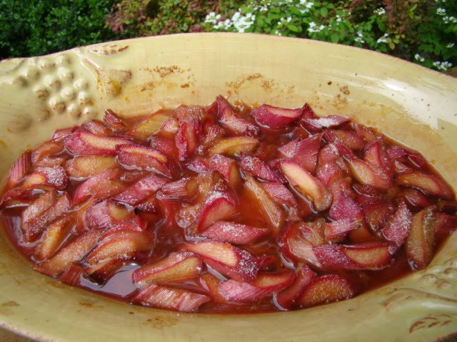 Imagine yourself seated on a terrace under a Wisteria in full bloom enjoying an elegant but simply prepared dessert with your friends on one of the warmer evenings of spring. While I was walking yesterday I saw a Wisteria in full bloom over a beautiful terrace in a neighbor's backyard and I began to think about hosting an annual Wisteria blooming party which of course features great food and wine. I came up with a simple, make ahead dessert idea for this fantasy garden party, just in case you wanted to play golf or take a hike the day of the party you could still serve a great dessert without slaving away in your kitchen. I adapted this recipe from Deborah Madison's new book, 'Seasonal Fruit Desserts'. I plan on serving baked rhubarb, something I've never tried, with one of my favorites, Laloo's Vanilla Flake goat's milk ice cream and cardamom cookies, another one of Deborah Madison's recipes.
