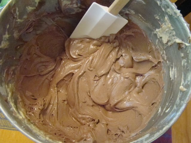 I cleaned off the beaters and added the cocoa and sugar mixture to the yellow batter, along with a splash of Frangelico. Beating until smooth, of course.