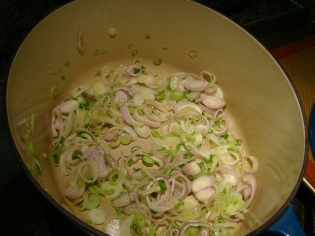 - Place olive oil in a heavy soup pot over medium heat, add shallots, spring onions, fennel and garlic. Sauté for 6-8 minutes, until tender.