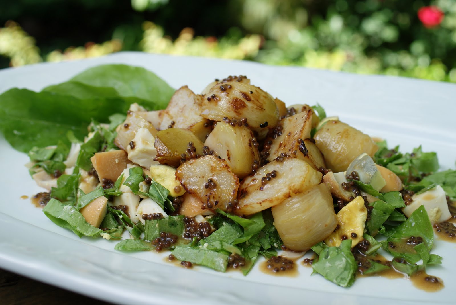 Spoon the sorrel-egg mixture on a large platter. Arrange the kohlrabi on top and drizzle with the warm honey mustard sauce. Add a few sorrel leaves to the platter.