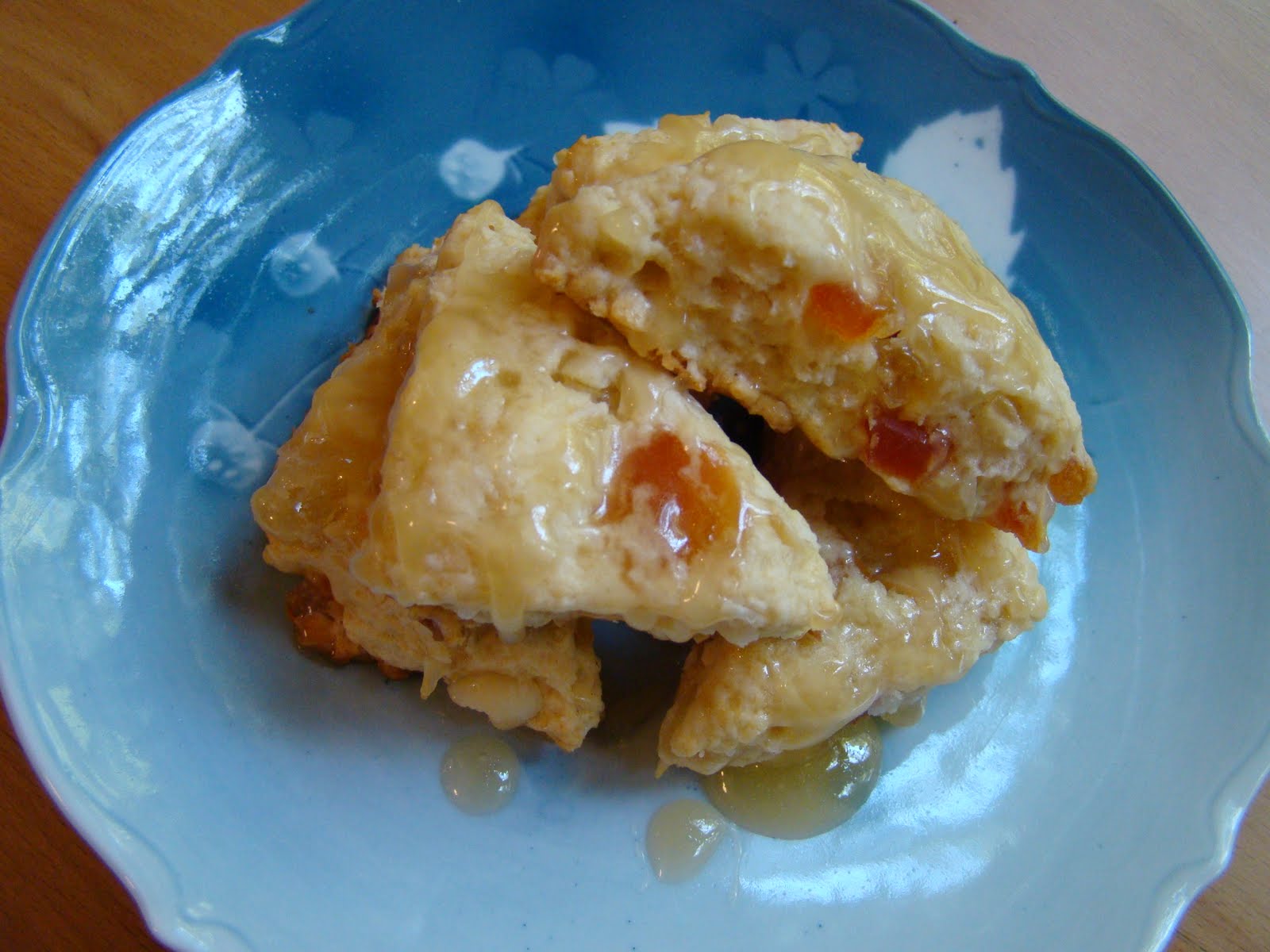 Bring honey and butter to a boil in a small saucepan, take off the heat, stir and add the vanilla extract. Let cool for 1 minute. Brush or drizzle the scones with the glaze as they come out of the oven. If you brush the scones, wait 15 minutes and brush on more glaze. I brushed and drizzled! This recipe makes more glaze than you will need for this recipe, store the rest in the refrigerator and use for toast.