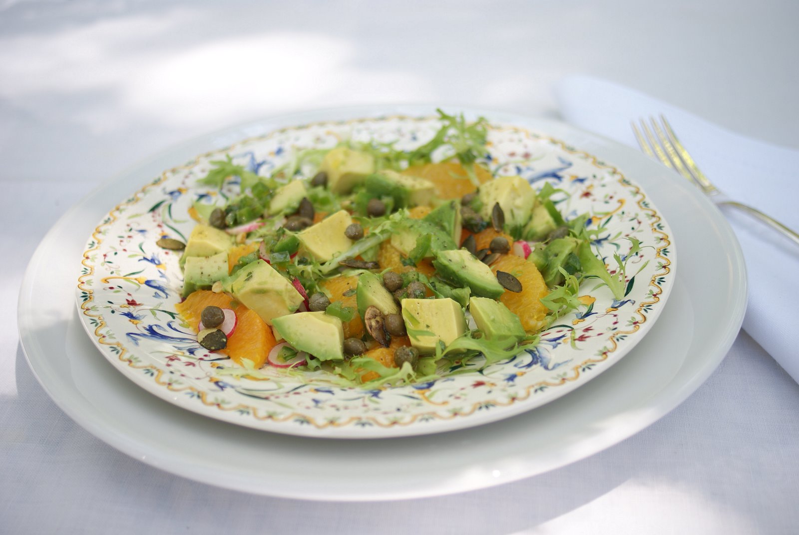 Recipe and Directions for Avocado and Orange Salad with Radishes, Pumpkin Seeds and Thai Basil