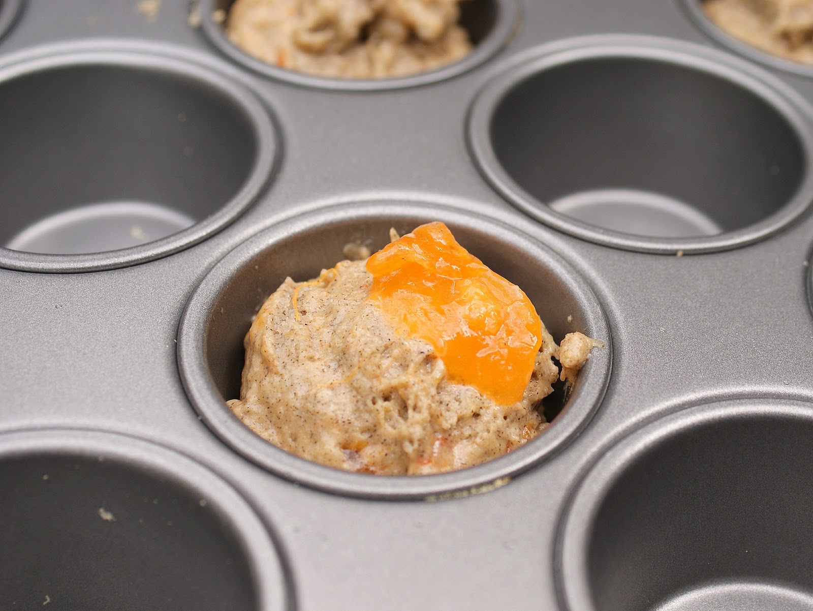 note:  I used two mini muffin pans and filled every other one with the batter so the muffins could bake evenly.  It looks nice to pull out a piece of persimmon from the batter to drape over the top of the muffin to show off the beautiful color.