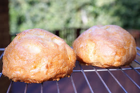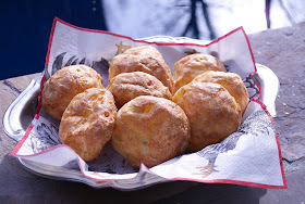 Normally my gougères fresh out of the oven look like these in the photo below that I took on my kitchen table. I make these often using a generous rounded tablespoon of the dough but I was feeling so very generous, I guess, that I pulled the ice cream scoop out of the kitchen drawer and went to work forming the big bun size pictured above. I also used a little trick that I picked up from a friend of mine who is an expert gougère maker, that is to sprinkle a generous pinch of Gruyère cheese on top before placing the tray in the hot oven. They are fairly simple to make but there are a few things to note about the recipe to make things go smoothly especially the first time making these cheesy puffs. It's important to have all the ingredients measured correctly and ready by the stove before lighting the flame under your medium size heavy saucepan. After bringing the 1/2 cup water, 1/2 cup milk, 8 tablespoons butter and 1/2 teaspoon salt to a boil, add all the 1 cup flour at once, lower the heat and stir with a wooden spatula for a few minutes until you have a smooth dough. Take the pan off the heat and if you're feeling strong you can beat each of the large 5 eggs in the dough, one at a time, with your wooden spatula until the dough is shiny. Turning the dough out of the pan into a standing mixer works very well, you can beat one egg at a time into the dough and beat for several minutes until shiny, then add the grated Gruyère cheese(about 5 ounces plus extra set aside for the tops) or combination of 3 to 1 Gruyère -Parmesan is also nice. It's important to form the dough into balls, which ever size you prefer, as soon as you're finished adding the grated cheese. Be sure to leave space between the dough balls on the baking sheet especially for the larger ones as they do expand a bit more than their smaller friends. Place the baking sheets lined with silpats or baking parchment into a preheated 425° oven, immediately turn down the oven to 375° and bake for 25 to 30 minutes for the larger gougères. I wouldn't open the oven to rotate the trays, until they've been baking for a good 20 minutes. I never rotate the trays when I bake these, they bake evenly in my oven but I know that's not the case with every oven, so check to see if the gougères are baking evenly in your oven before rotating the trays. Bake until they are nicely puffed and golden in color. Cool on a metal rack.